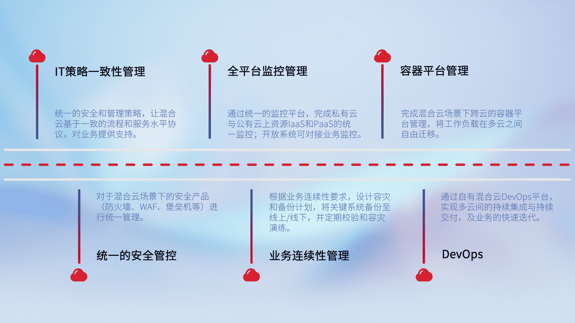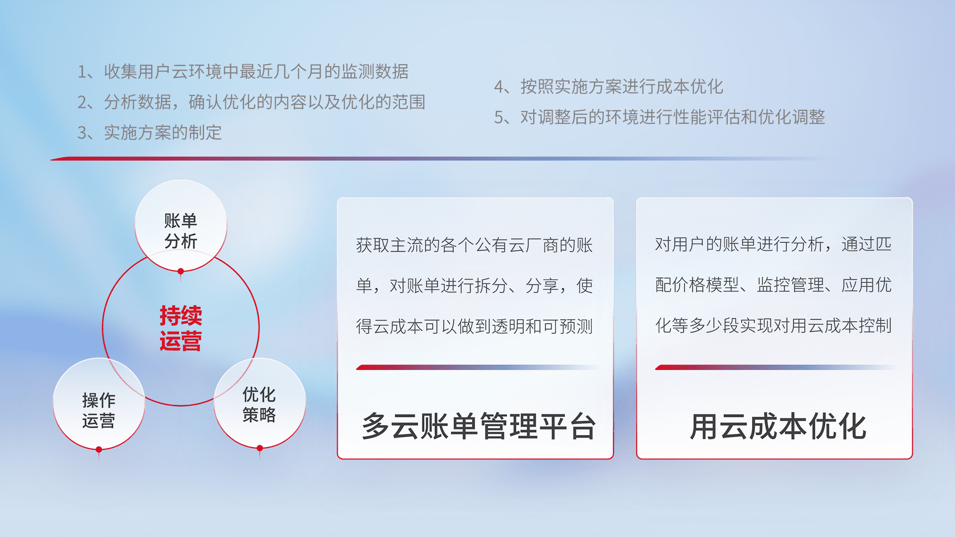 通过多云纳管,,,,以统一的资源数据模型把客户的云资源进行抽象和封装,,进而实现对多云资源的统一操作,,,保障云资源管理的可靠性、、稳定性与可用性。。量身定制化运维内容,,,配置、、、开发运维、、补丁管理、、、备份、、、监控、、、、认证和访问管理、、审计和日常巡检等,,,保障在用云过程中的可靠度,,,稳定度以及高可用率。。。