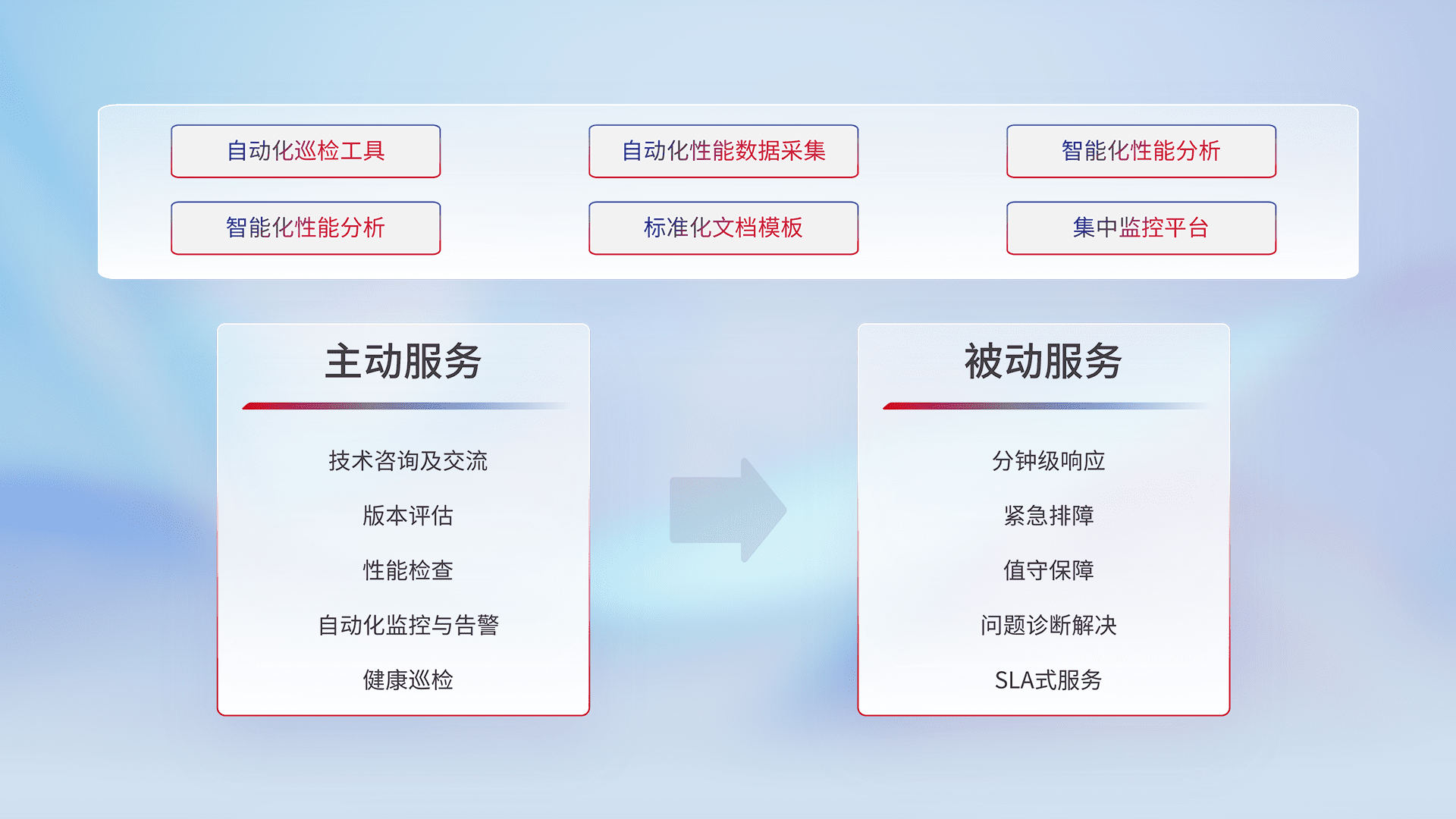 智能化工具和标准化文档,,,保障服务质量,,,,提供主动服务(包含技术咨询、、、版本评估、、、、性能检查、、自动化监控与告警、、、、健康巡检)和被动服务包含(分钟级响应、、、紧急排障、、、值守保障、、、、问题诊断解决、、SLA服务)。。。