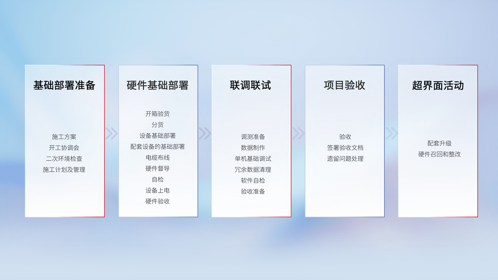 从基础部署准备、、、硬件基础部署、、联调联试、、、项目验收、、、越界面活动的全过程可追溯,,,保证施工质量和进度。。。。